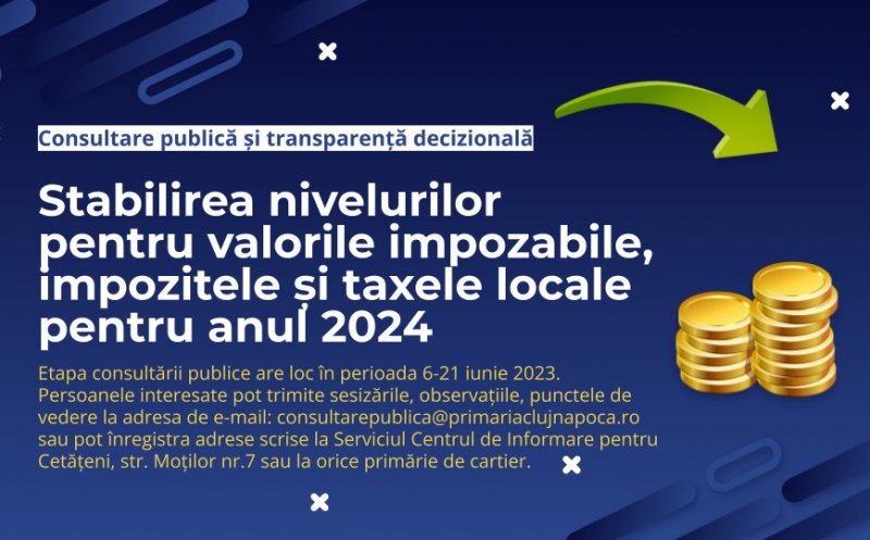 Primăria municipiului Cluj-Napoca a inițiat procedura de consultare publică, în conformitate cu prevederile Legii 52/2003 privind consultarea publică și transparența decizională referitoare la proiectul de Hotărâre privind stabilirea nivelurilor pentru valorile impozabile, impozitele și taxele locale pentru anul 2024.