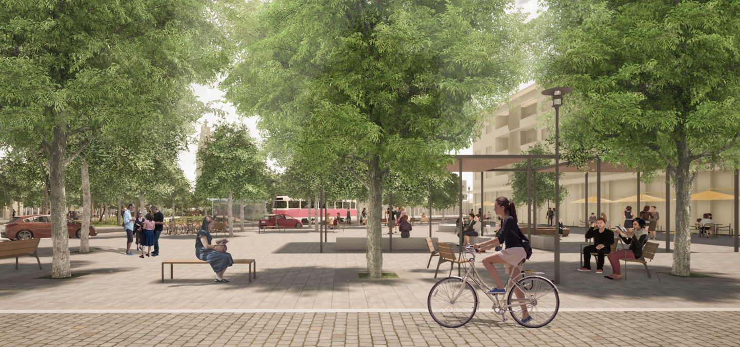 “Piața Karl Liebknecht este transformată dintr-un spațiu existent dedicat preponderent parcărilor într-un scuar urban pietonal cu rol de centru de cartier. Înspre strada Oașului se propune plantarea unui rând de arbori pentru a diminua prezența traficului ridicat în spațiul scuarului pietonal, urmărindu-se și reducerea emisiilor poluante generate de traficul auto.