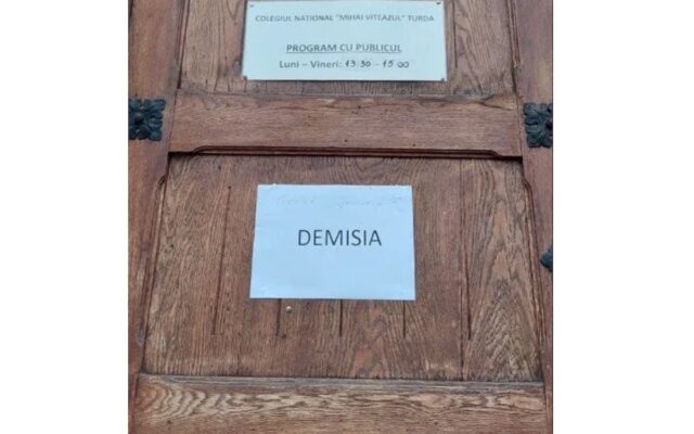Pe ușa celui mai important liceu din Turda a fost lipită o hârtie cu mesajul „Demisia”, pe fondul grevei japoneze în care au intrat azi profesorii.