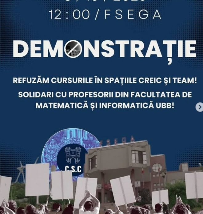 „PROTEST JOI, ORA 12 IMPOTRIVA DESFĂȘURĂRII ORELOR IN CAMPUSUL CREIC. Încă de la începutul anului universitar, studenții au semnalat în mod constant neregulile întâmpinate în desfășurarea actului educațional din Campusul CREIC/TEAM. În urma lipsei de reacție și a unor răspunsuri clare, ne simțim, încă odată, neauziți. Joi, începând cu ora 12:00 în fața Clădirii Centrale UBB, de pe Str. Mihail Kogâlniceanu, vom protesta cu scopul de a suspenda activitatea didactică în Chinteni”, a OSUBB, oragnizația studenților din UBB.