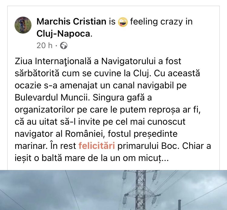 „Ziua Internaţională a Navigatorului a fost sărbătorită cum se cuvine la Cluj. Cu această ocazie, s-a amenajat un canal navigabil pe Bulevardul Muncii. Singura gafă a organizatorilor pe care le putem reproșa ar fi că au uitat să-l invite pe cel mai cunoscut navigator al României, fostul președinte marinar. În rest, felicitări primarului Boc. Chiar a ieșit o baltă mare de la un om micuț…”