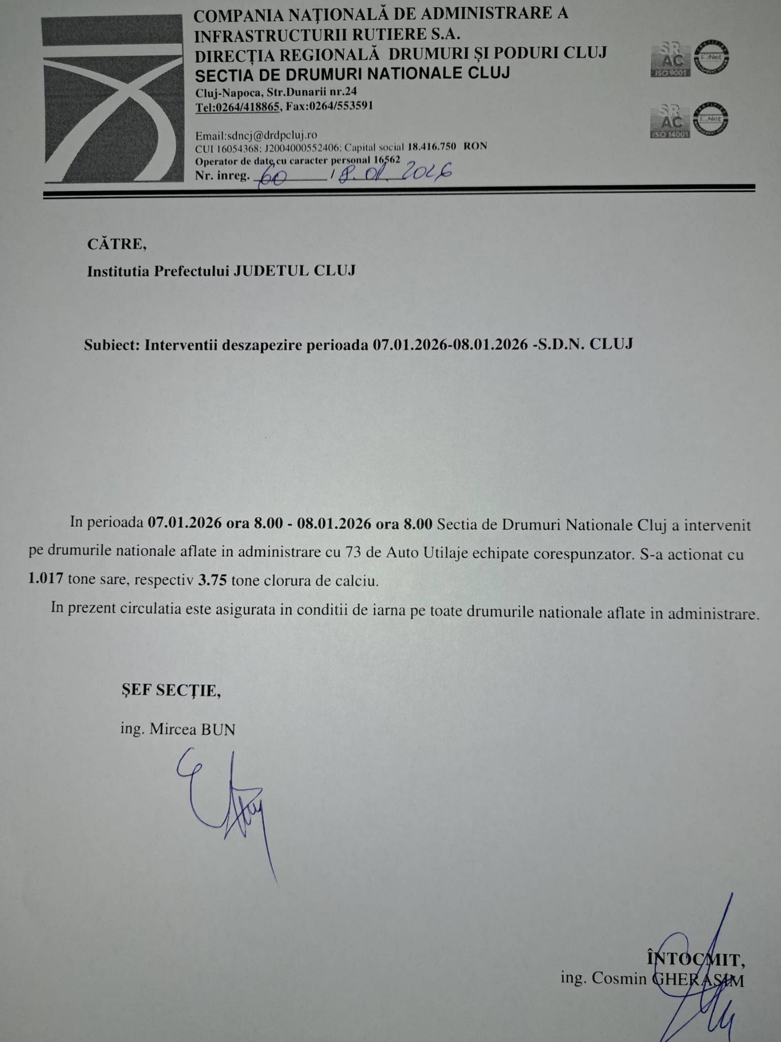 Cu toate acestea, Instituția Prefectului – Județul Cluj face apel la conducătorii auto să manifeste o prudență sporită, să respecte indicațiile autorităților și să adapteze conduita de deplasare la condițiile reale de drum.