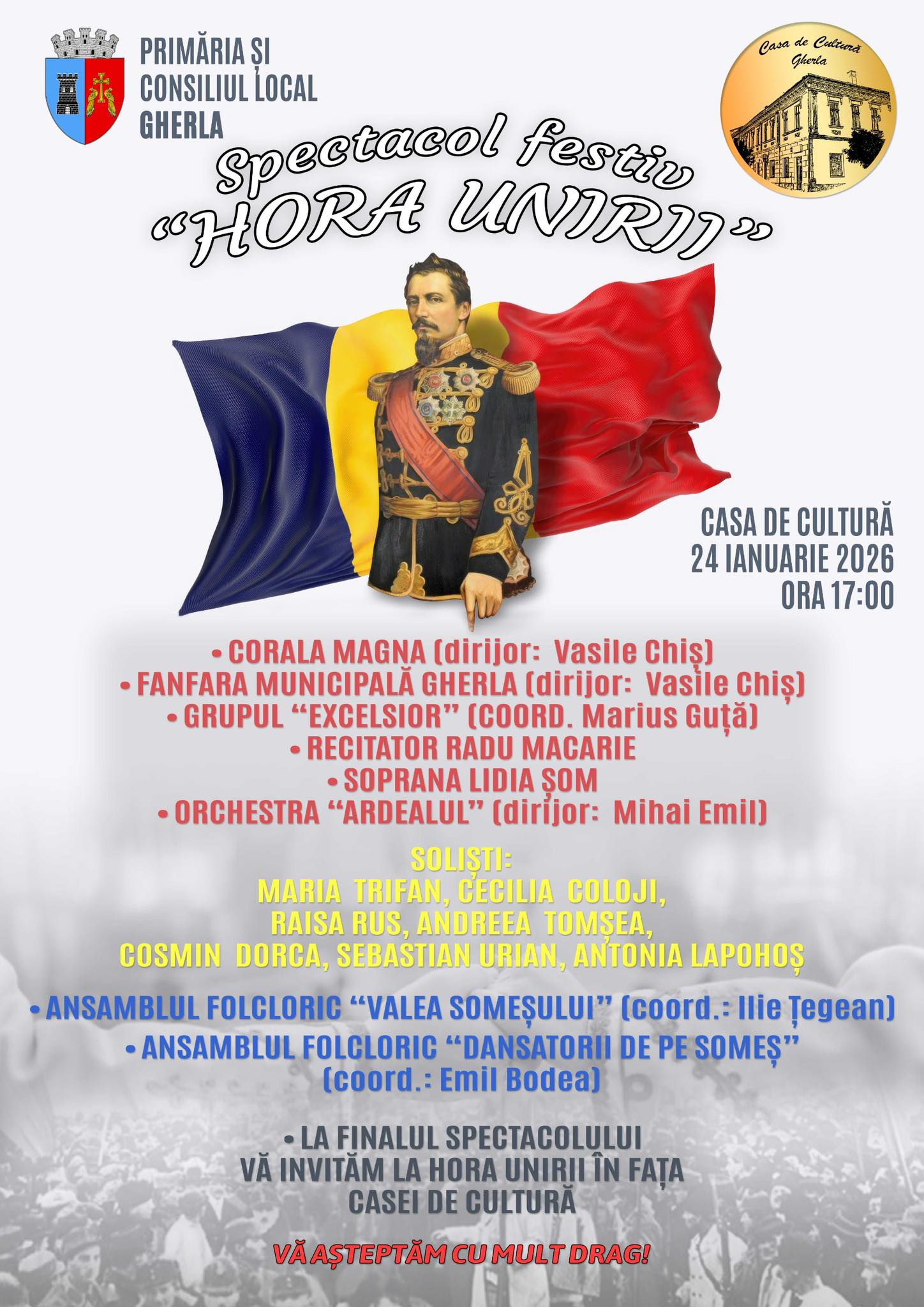 Spectacol festiv „Hora Unirii”, la Casa de Cultură din Gherla, sâmbătă, 24 ianuarie, ora 17:00. Abonare la newsletter: Trimite Share