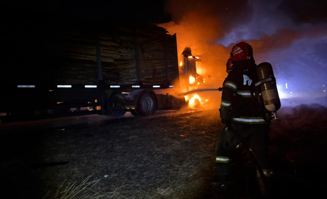 Apelul de urgență a venit în jurul orei 06.40, iar la fața locului au fost mobilizate două autospeciale de stingere și un echipaj SMURD. Până la sosirea pompierilor, șoferul a reușit să se autoevacueze și nu a necesitat îngrijiri medicale. Flăcările s-au manifestat generalizat, cu degajări mari de fum, la capul tractor al autotrenului care transporta lemne.