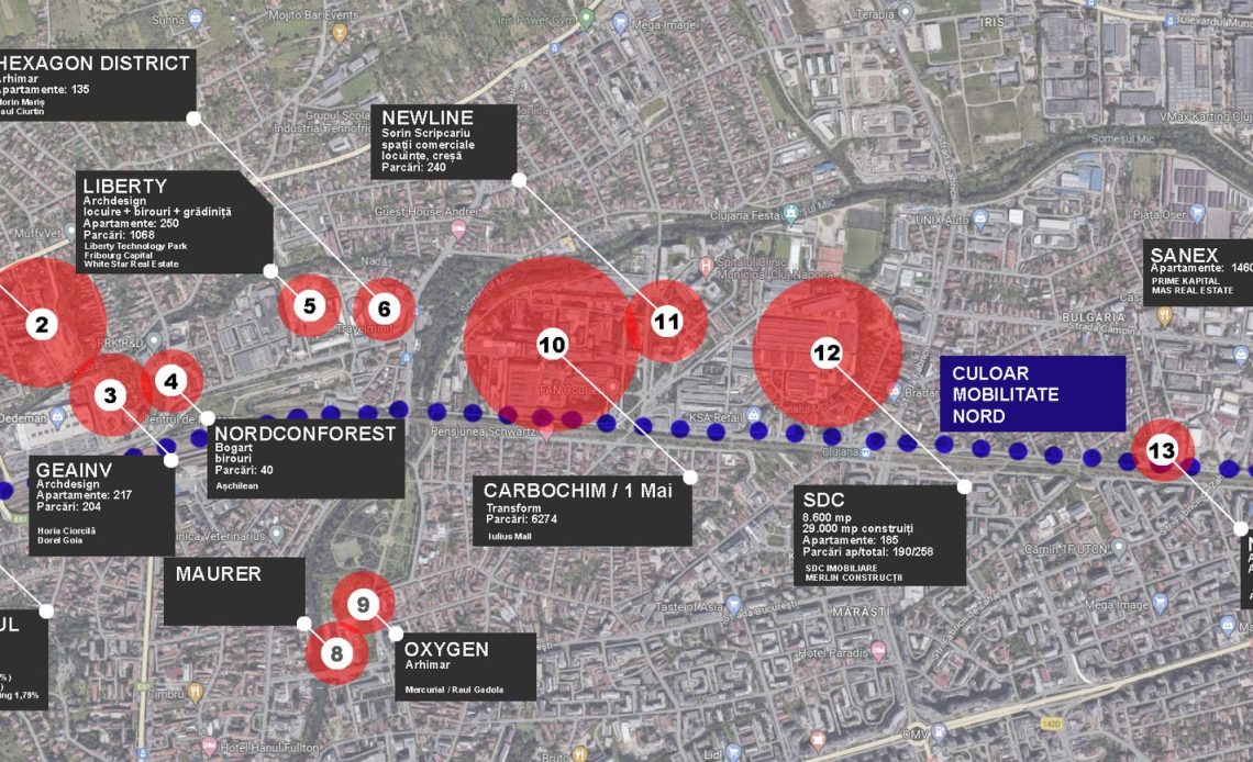 Cu toate că CMN e abia în fașa planșei, azi dezvoltarea zonei de Nord e deja acaparată de 14 proiecte imobiliare gigant – înaintate de dezvoltatorii privilegiați ai soartei Clujului, pe aproape 30 hectare numai de-a lungul culoarului.