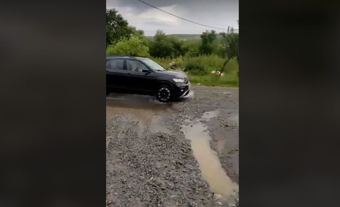 „DJ 107L, Crăești, comuna Petreștii de Jos. Uitați aici carosabilul blocat, uitați așa, cum vine din curbă…”