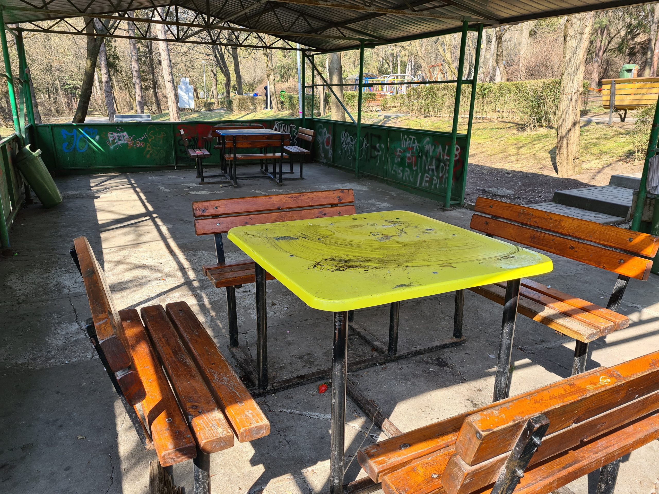 Mesele și scaunele din parc au aspectul dezolant al locurilor de popas părăsite de pe marginea drumurilor naționale: